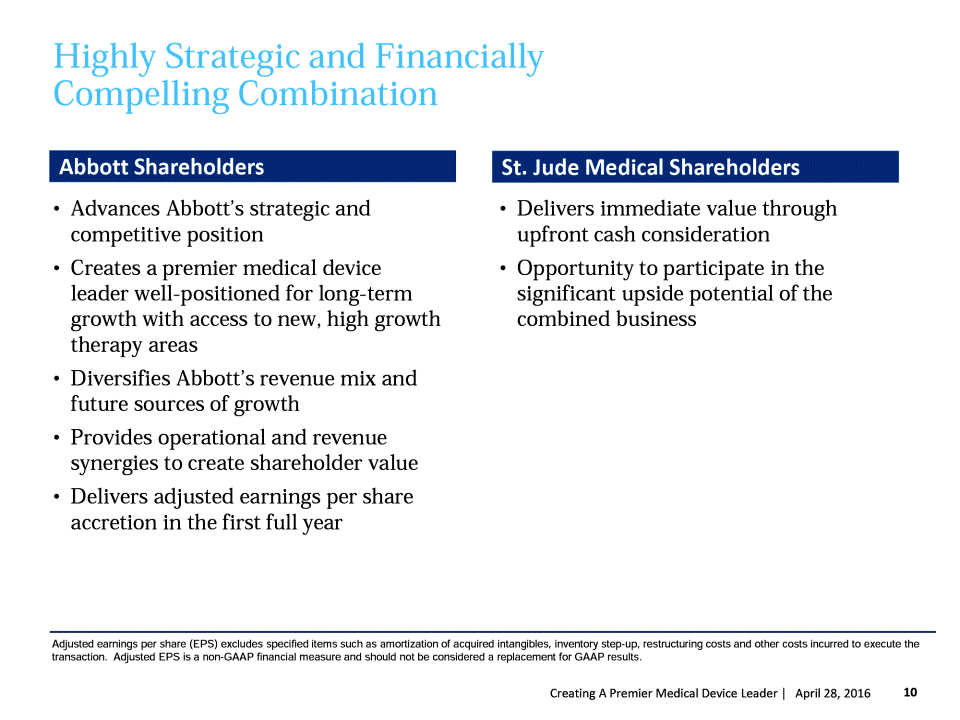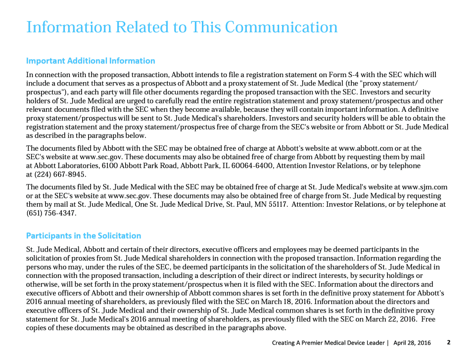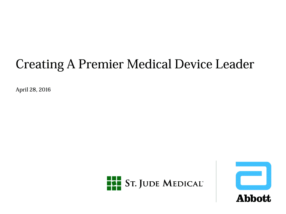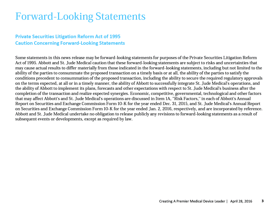 Information Related to This Communication Important Additional Information In connection with the proposed transaction, Abbott intends to file a registration statement on Form S-4 with the SEC which will include a document that serves as a prospectus of Abbott and a proxy statement of St. Jude Medical (the "proxy statement/ prospectus"), and each party will file other documents regarding the proposed transaction with the SEC. Investors and security holders of St. Jude Medical are urged to carefully read the entire registration statement and proxy statement/prospectus and other relevant documents filed with the SEC when they become available, because they will contain important information. A definitive proxy statement/prospectus will be sent to St. Jude Medical's shareholders. Investors and security holders will be able to obtain the registration statement and the proxy statement/prospectus free of charge from the SEC's website or from Abbott or St. Jude Medical as described in the paragraphs below. The documents filed by Abbott with the SEC may be obtained free of charge at Abbott's website at www.abbott.com or at the SEC's website at www.sec.gov. These documents may also be obtained free of charge from Abbott by requesting them by mail at Abbott Laboratories, 6100 Abbott Park Road, Abbott Park, IL 60064-6400, Attention Investor Relations, or by telephone at (224) 667-8945. The documents filed by St. Jude Medical with the SEC may be obtained free of charge at St. Jude Medical's website at www.sjm.com or at the SEC's website at www.sec.gov. These documents may also be obtained free of charge from St. Jude Medical by requesting them by mail at St. Jude Medical, One St. Jude Medical Drive, St. Paul, MN 55117. Attention: Investor Relations, or by telephone at (651) 756-4347. Participants in the Solicitation St. Jude Medical, Abbott and certain of their directors, executive officers and employees may be deemed participants in the solicitation of proxies from St. Jude Medical shareholders in connection with the proposed transaction. Information regarding the persons who may, under the rules of the SEC, be deemed participants in the solicitation of the shareholders of St. Jude Medical in connection with the proposed transaction, including a description of their direct or indirect interests, by security holdings or otherwise, will be set forth in the proxy statement/prospectus when it is filed with the SEC. Information about the directors and executive officers of Abbott and their ownership of Abbott common shares is set forth in the definitive proxy statement for Abbott's 2016 annual meeting of shareholders, as previously filed with the SEC on March 18, 2016. Information about the directors and executive officers of St. Jude Medical and their ownership of St. Jude Medical common shares is set forth in the definitive proxy statement for St. Jude Medical's 2016 annual meeting of shareholders, as previously filed with the SEC on March 22, 2016. Free copies of these documents may be obtained as described in the paragraphs above. 2 Creating A Premier Medical Device Leader | April 27, 2016