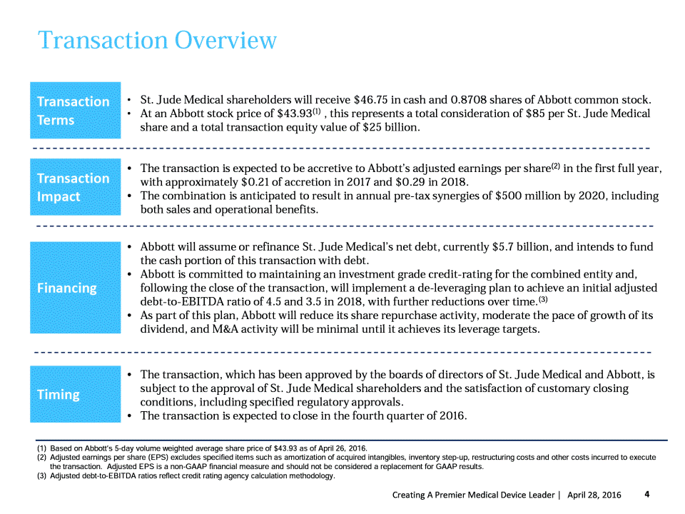 Forward-Looking Statements Private Securities Litigation Reform Act of 1995 Caution Concerning Forward-Looking Statements Some statements in this news release may be forward-looking statements for purposes of the Private Securities Litigation Reform Act of 1995. Abbott and St. Jude Medical caution that these forward-looking statements are subject to risks and uncertainties that may cause actual results to differ materially from those indicated in the forward-looking statements, including but not limited to the ability of the parties to consummate the proposed transaction on a timely basis or at all, the ability of the parties to satisfy the conditions precedent to consummation of the proposed transaction, including the ability to secure the required regulatory approvals on the terms expected, at all or in a timely manner, the ability of Abbott to successfully integrate St. Jude Medical's operations, and the ability of Abbott to implement its plans, forecasts and other expectations with respect to St. Jude Medical's business after the completion of the transaction and realize expected synergies. Economic, competitive, governmental, technological and other factors that may affect Abbott's and St. Jude Medical's operations are discussed in Item 1A, "Risk Factors,'' in each of Abbott's Annual Report on Securities and Exchange Commission Form 10-K for the year ended Dec. 31, 2015, and St. Jude Medical's Annual Report on Securities and Exchange Commission Form 10-K for the year ended Jan. 2, 2016, respectively, and are incorporated by reference. Abbott and St. Jude Medical undertake no obligation to release publicly any revisions to forward-looking statements as a result of subsequent events or developments, except as required by law. 3 Creating A Premier Medical Device Leader | April 27, 2016