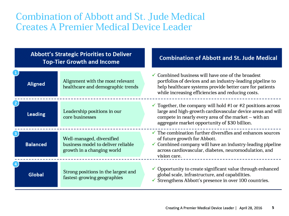 Transaction Overview St. Jude Medical shareholders will receive $46.75 in cash and 0.8708 shares of Abbott common stock. At an Abbott stock price of $43.93(1) , this represents a total consideration of $85 per St. Jude Medical share and a total transaction equity value of $25 billion. The transaction is expected to be accretive to Abbotts adjusted earnings per share(2) in the first full year, with approximately $0.21 of accretion in 2017 and $0.29 in 2018. The combination is anticipated to result in annual pre-tax synergies of $500 million by 2020, including both sales and operational benefits. Abbott will assume or refinance St. Jude Medicals net debt, currently $5.7 billion, and intends to fund the cash portion of this transaction with debt. Abbott is committed to maintaining an investment grade credit-rating for the combined entity and, following the close of the transaction, will implement a de-leveraging plan to achieve an initial adjusted debt-to-EBITDA ratio of 4.5 and 3.5 in 2018, with further reductions over time.(3) As part of this plan, Abbott will reduce its share repurchase activity, moderate the pace of growth of its dividend, and M&A activity will be minimal until it achieves its leverage targets. The transaction, which has been approved by the boards of directors of St. Jude Medical and Abbott, is subject to the approval of St. Jude Medical shareholders and the satisfaction of customary closing conditions, including specified regulatory approvals. The transaction is expected to close in the fourth quarter of 2016. (1) Based on Abbotts 5-day volume weighted average share price of $43.93 as of April 26, 2016. (2) Adjusted earnings per share (EPS) excludes specified items such as amortization of acquired intangibles, inventory step-up, restructuring costs and other costs incurred to execute the transaction. Adjusted EPS is a non-GAAP financial measure and should not be considered a replacement for GAAP results. (3) Adjusted debt-to-EBITDA ratios reflect credit rating agency calculation methodology. 4 Creating A Premier Medical Device Leader | April 27, 2016 Timing Financing Transaction Impact Transaction Terms