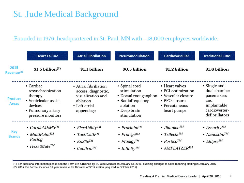 Combination of Abbott and St. Jude Medical Creates A Premier Medical Device Leader Combined business will have one of the broadest portfolios of devices and an industry-leading pipeline to help healthcare systems provide better care for patients while increasing efficiencies and reducing costs. Alignment with the most relevant healthcare and demographic trends Together, the company will hold #1 or #2 positions across large and high-growth cardiovascular device areas and will compete in nearly every area of the market with an aggregate market opportunity of $30 billion. Leadership positions in our core businesses The combination further diversifies and enhances sources of future growth for Abbott. Combined company will have an industry-leading pipeline across cardiovascular, diabetes, neuromodulation, and vision care. Well-managed, diversified business model to deliver reliable growth in a changing world Opportunity to create significant value through enhanced global scale, infrastructure, and capabilities. Strengthens Abbotts presence in over 100 countries. Strong positions in the largest and fastest-growing geographies 5 Creating A Premier Medical Device Leader | April 27, 2016 4 Global 3 Balanced 2 Leading 1 Aligned Combination of Abbott and St. Jude Medical Abbotts Strategic Priorities to Deliver Top-Tier Growth and Income