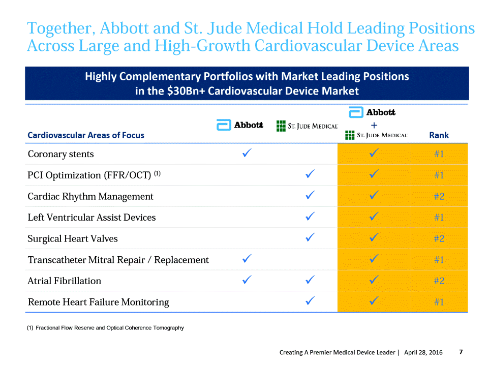 St. Jude Medicals strong positions in heart failure devices, atrial fibrillation and cardiac rhythm management complement Abbotts leading positions in coronary intervention and transcatheter mitral repair. Together, the company will compete in nearly every area of the cardiovascular market and hold the No. 1 or 2 positions across large and high-growth cardiovascular device markets. This best-in-class combined portfolio will have the depth, breadth and innovation to help patients restore their health, reduce costs for payors and deliver greater value to customers.