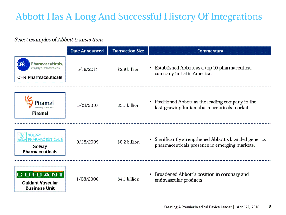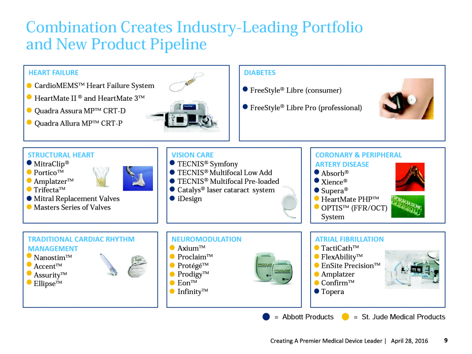 Abbott Has A Long And Successful Of Integrations Select examples of Abbott transactions Established Abbott as a top 10 pharmaceutical company in Latin America. 5/16/2014 $2.9 billion Positioned Abbott as the leading company in the fast-growing Indian pharmaceuticals market. 5/21/2010 $3.7 billion Significantly strengthened Abbotts branded generics pharmaceuticals presence in emerging markets. 9/28/2009 $6.2 billion Broadened Abbotts position in coronary and endovascular products. 1/08/2006 $4.1 billion 8 Creating A Premier Medical Device Leader | April 27, 2016 Guidant Vascular Business Unit Solvay Pharmaceuticals Piramal CFR Pharmaceuticals Transaction Size Commentary Date Announced