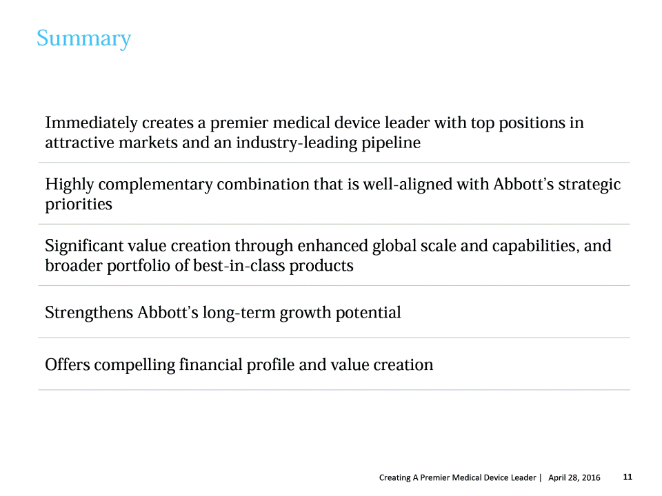 Highly Strategic and Financially Compelling Combination Advances Abbotts strategic and competitive position Creates a premier medical device leader well-positioned for long-term growth with access to new, high growth therapy areas Diversifies Abbotts revenue mix and future sources of growth Provides operational and revenue synergies to create shareholder value Delivers adjusted earnings per share accretion in the first full year Delivers immediate value through upfront cash consideration Opportunity to participate in the significant upside potential of the combined business Adjusted earnings per share (EPS) excludes specified items such as amortization of acquired intangibles, inventory step-up, restructuring costs and other costs incurred to execute the transaction. Adjusted EPS is a non-GAAP financial measure and should not be considered a replacement for GAAP results. 10 Creating A Premier Medical Device Leader | April 27, 2016 St. Jude Medical Shareholders Abbott Shareholders